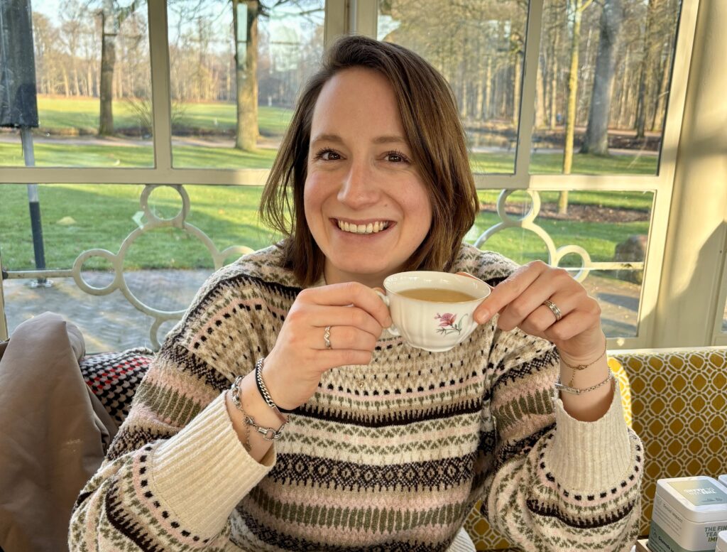 Maar voordat we meteen overgaan op ons werk, eerst even wat over mij persoonlijk. Ten eerste: ik ben een echte theeleut (zoals te zien op de foto). Dus ik zal nooit nee zeggen tegen samen thee drinken! Verder trek ik regelmatig mijn wandelschoenen aan en ga ik graag naar concerten. Ik woon inmiddels in Nijmegen, maar kom uit Veldhoven. De zachte G en Brabantse gezelligheid zitten dus zeker in mijn systeem.